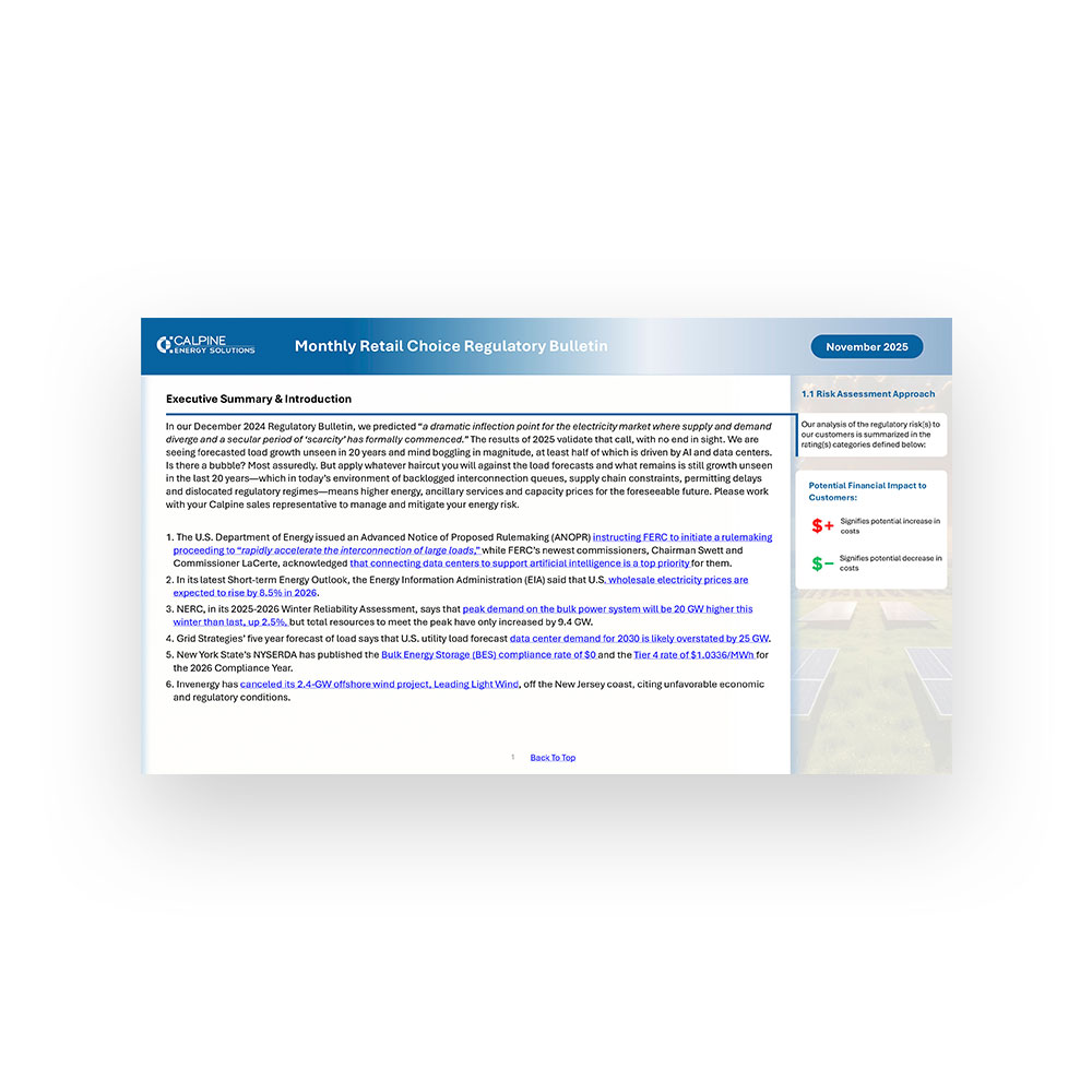 In our December 2024 Regulatory Bulletin, we predicted “a dramatic inflection point for the electricity market where supply and demand diverge and a secular period of ‘scarcity’ has formally commenced.” The results of 2025 validate that call, with no end in sight. We are seeing forecasted load growth unseen in 20 years and mind boggling in magnitude, at least half of which is driven by AI and data centers. Is there a bubble? Most assuredly. But apply whatever haircut you will against the load forecasts and what remains is still growth unseen in the last 20 years—which in today’s environment of backlogged interconnection queues, supply chain constraints, permitting delays and dislocated regulatory regimes—means higher energy, ancillary services and capacity prices for the foreseeable future. Please work with your Calpine sales representative to manage and mitigate your energy risk.